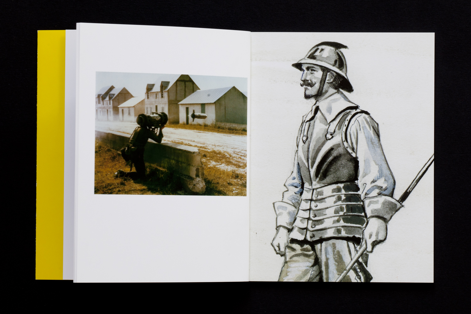 "This photo scrapbook brings collected images of soldiers together with those of vintage pin-ups. The soldiers, actors or real, are usually sighting along the barrel of a gun or rocket launcher. The pin-up models are both subject to, and the sovereigns of this attention. Their duty as targets is only occasionally relieved by such icons of Islamic otherness as the Ayatollah Khomeini and a Palestinian hostage-taker of the Black September group. While this book structures itself by the old stories of the hetero male gaze and male violence that depressingly, still apply, perhaps most interesting is the fluctuating qualities of the gaze which the soldiers both elicit and are subject to as targets themselves. Some men methodically conduct the business of war, others strike hammy, testosterone-filled poses, or, finally, soldiers run anonymously along the beach, dark smudges themselves trying to survive violence and persevere in the fullness of life." - Printed Matter